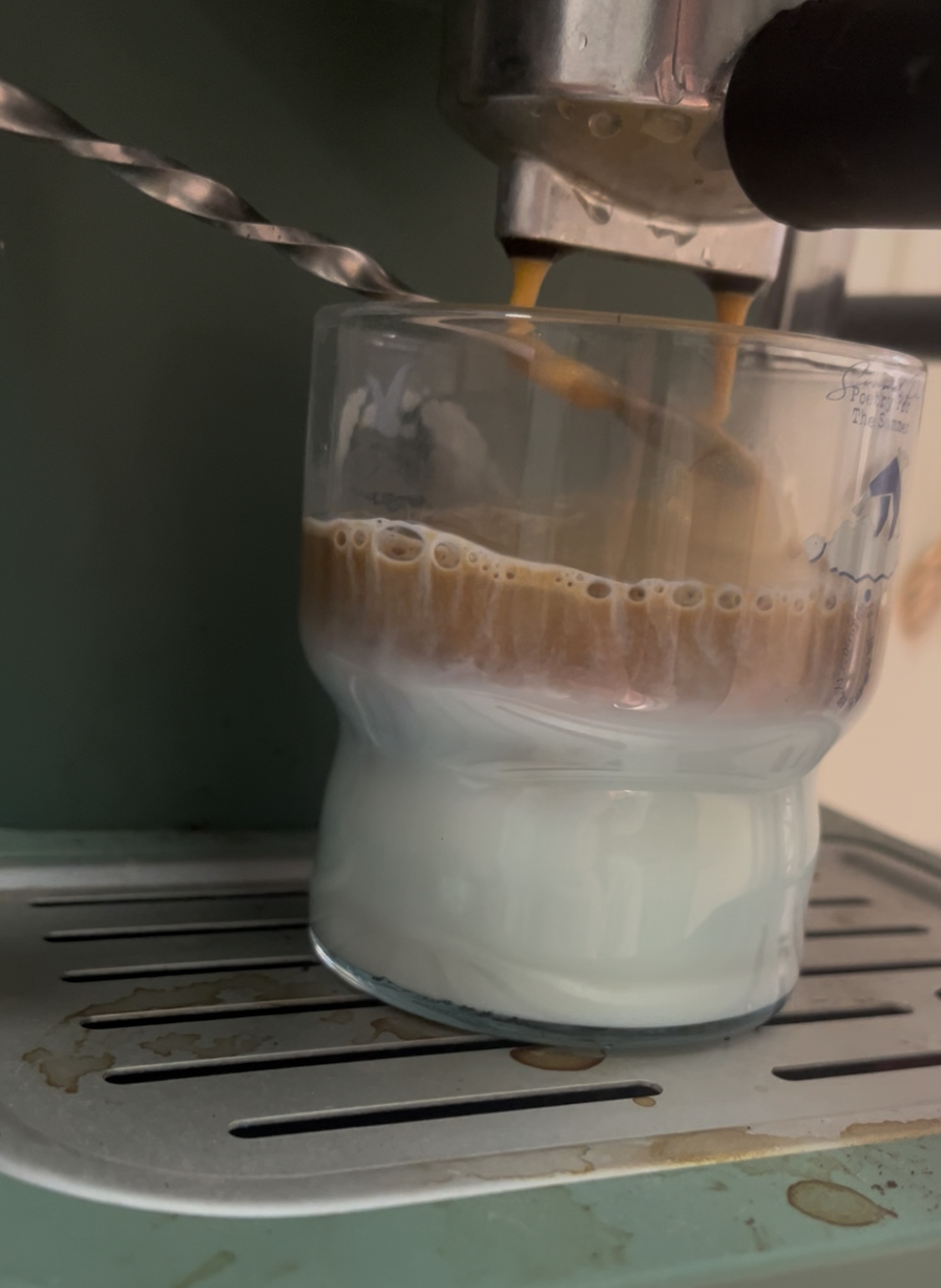 用自带分层杯子装牛奶来接咖啡液,就可以实现完美分层。